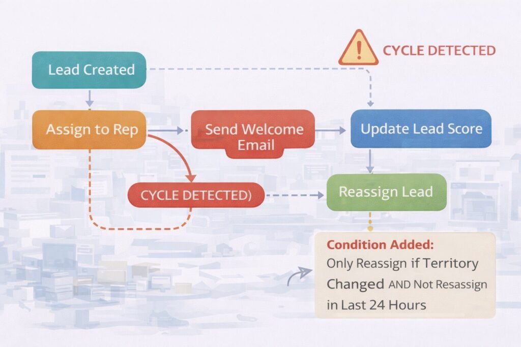 Lead assignment workflow triggered lead score update, which triggered re-assignment workflow, which triggered score update again. One lead created 847 workflow executions before we emergency-disabled the system. Their workflow execution costs spiked from $400/month to $12,000/month in one week.